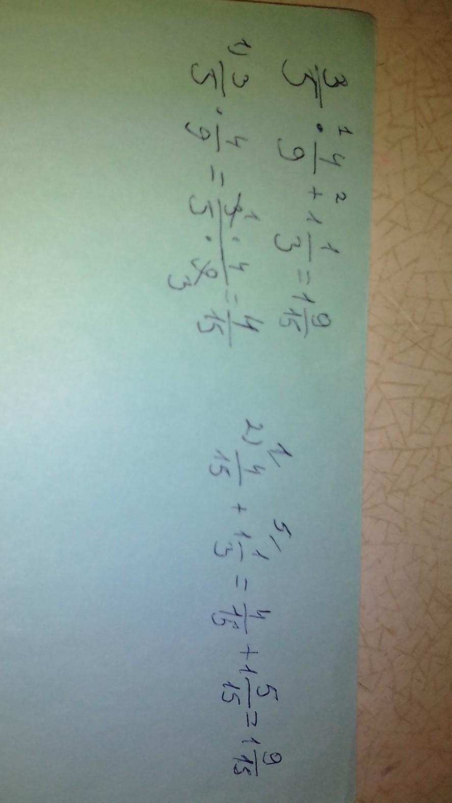 Ответ:1)3/5*4/9=3*4/5*9 сокращаем 3 и 9 получаем 1 и 3 тогда 1*4/5*3 = 4/15, а 4/15+1 1/3 =4/15+1 5/15=1 9/15.