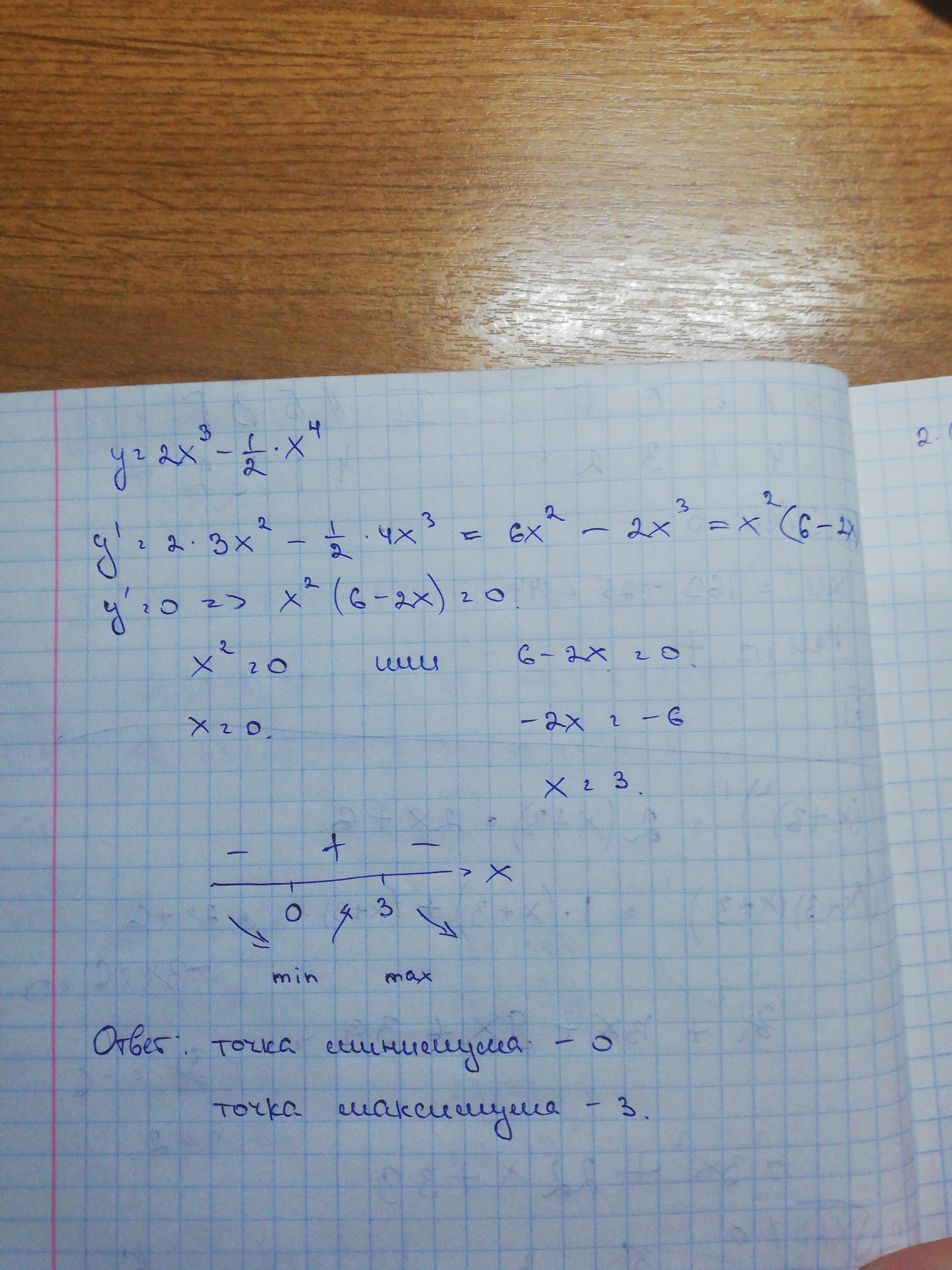 Сначала находим производную функции, затем приравниваем ее к нулю, чтобы определить критические и стационарные точки. Получилось 0 и 3