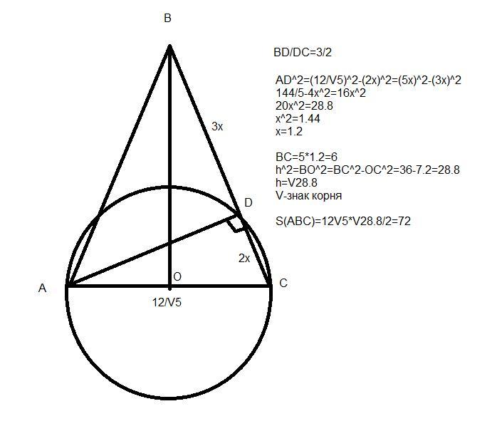 на основании AC равнобедренного треугльника ABC как на диаметре построена окружность, пересекающая боковую сторону BC в точке D так, что BD:DC=3:2.Найти площадь треугольника ABC, если AD=12/√5