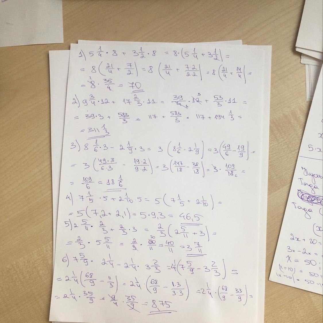 1)5 1/4 * 8 + 3 1/2 * 8; 2)9 3/4 * 12 + 17 2/3 * 11;3)8 1/6*3- 2 1/9 * 3;4)7 1/5 * 5 + 2 1/10*5; 5)2 5/11 * 2/3 +2/3*3 15/22;6)7 5/9 *2 1/4 - 2 1/4 * 3 2/3;