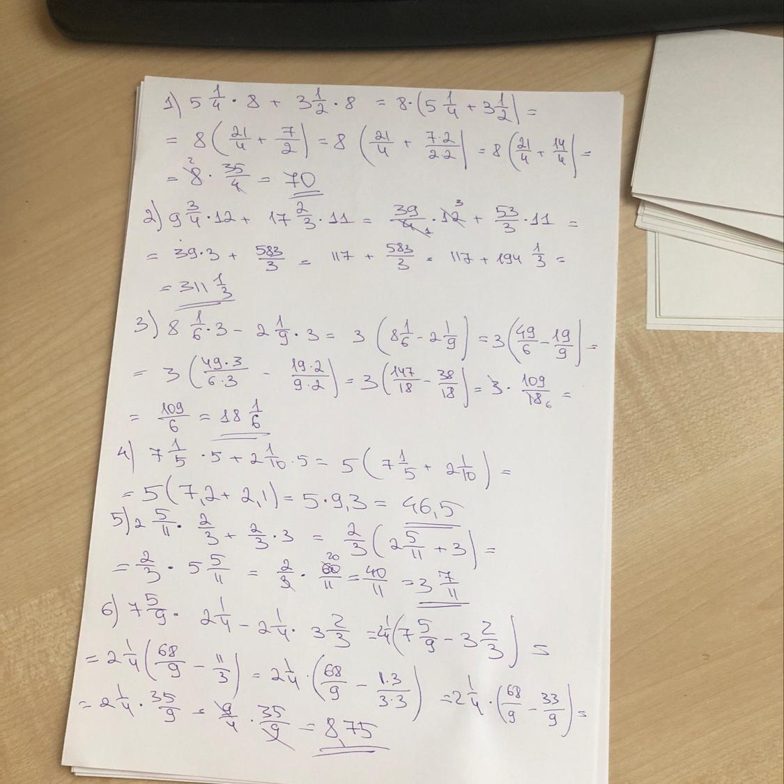 1)5 1/4 * 8 + 3 1/2 * 8; 2)9 3/4 * 12 + 17 2/3 * 11;3)8 1/6*3- 2 1/9 * 3;4)7 1/5 * 5 + 2 1/10*5; 5)2 5/11 * 2/3 +2/3*3 15/22;6)7 5/9 *2 1/4 - 2 1/4 * 3 2/3;