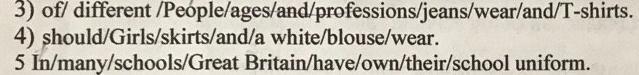 Объяснение:4) первое идёт Subject потом Should, после should тоько глагол в единственном числе тоесть infinitive , после wear skirts так как он во множественном числе то там не ставится артикль, затем a white blouse.