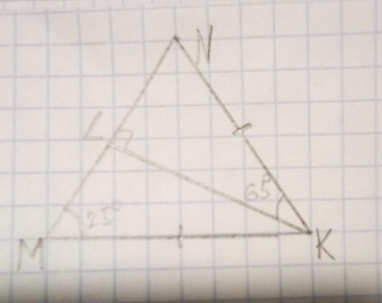 Угол LNK=180(т.к. сумма углов тр =180°)-(90+65)=25°