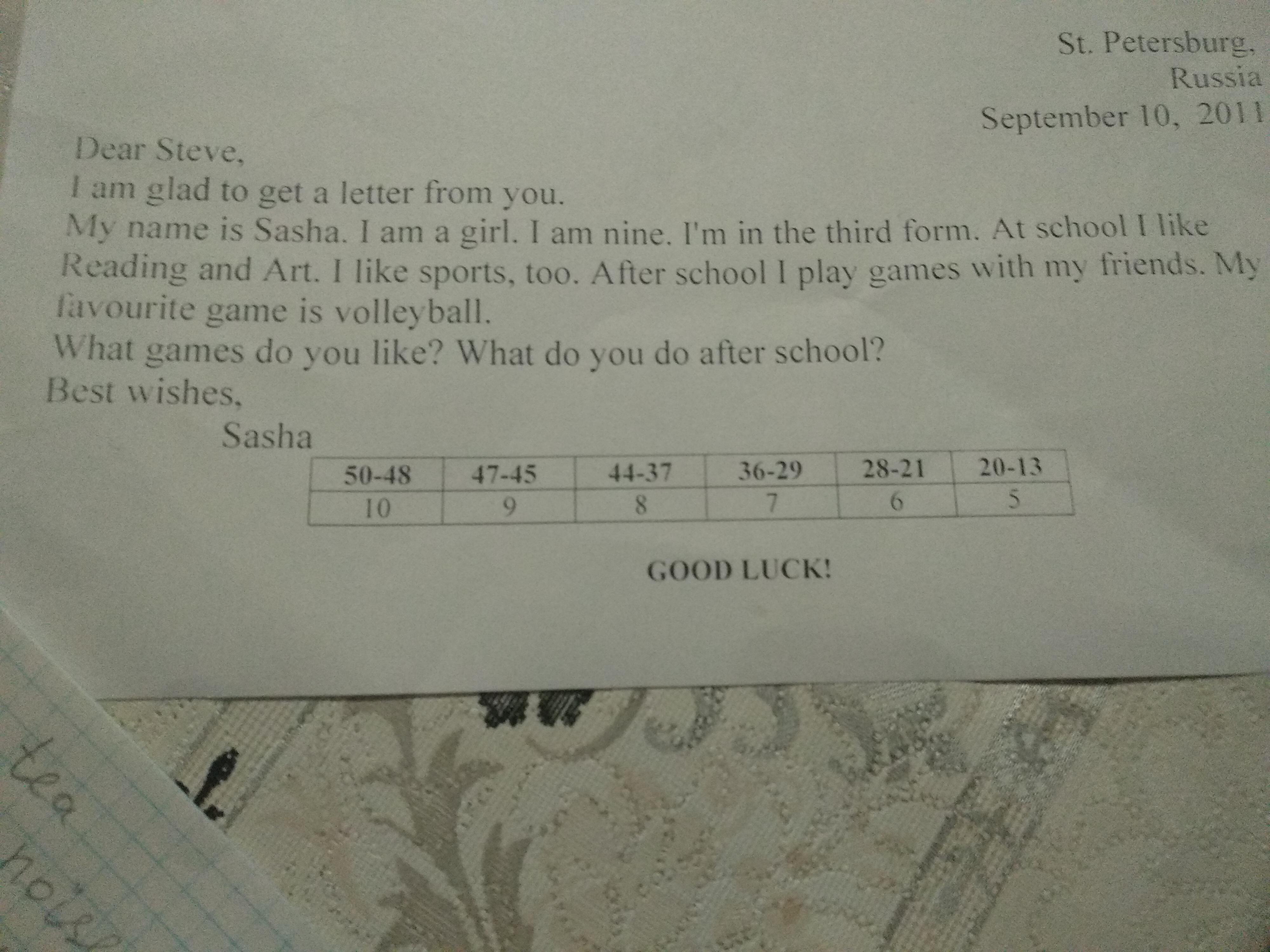 Меня зовут Саша.Я девочка.Мне девять.Я в третьем классе.В школе я люблю чтение и рисование.Я тоже люблю спорт.После школы я играю со своими дркзьями.Моя любимая игра волейбол.