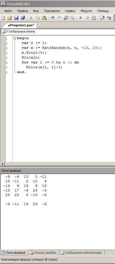 Заполнить матрицу 5х5 случайными числами в интервале [-15,25] и вывести ее на экран Вывести на экран главную диагональ квадратной матрицы