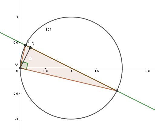 через центр окружности x^2+y^2=2x проведена прямая, параллельная прямой x+2y=0 и пересекающая окружность в точках A и B. найдите площадь треугольника AOB, где точка О - начало координат