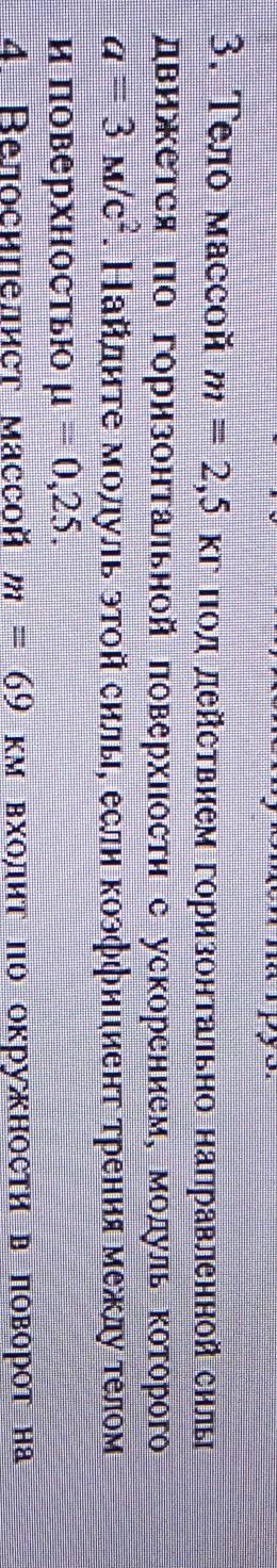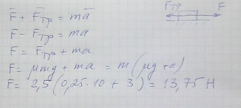 Тело массой m=2,5 кг под действием горизонтально направленной силы движется по горизонтальной поверхности с ускорением, модуль которого a=3 м/с^2. Найдите модуль этой силы, если коэффициент трения между телом и поверхностью H 0.25.