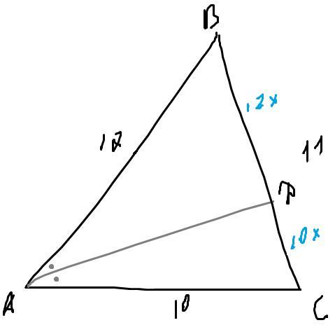 Стороны треугольника равны 10 11 и 12см найдите отрезки на которые делит биссектриса треугольник среднюю сторону