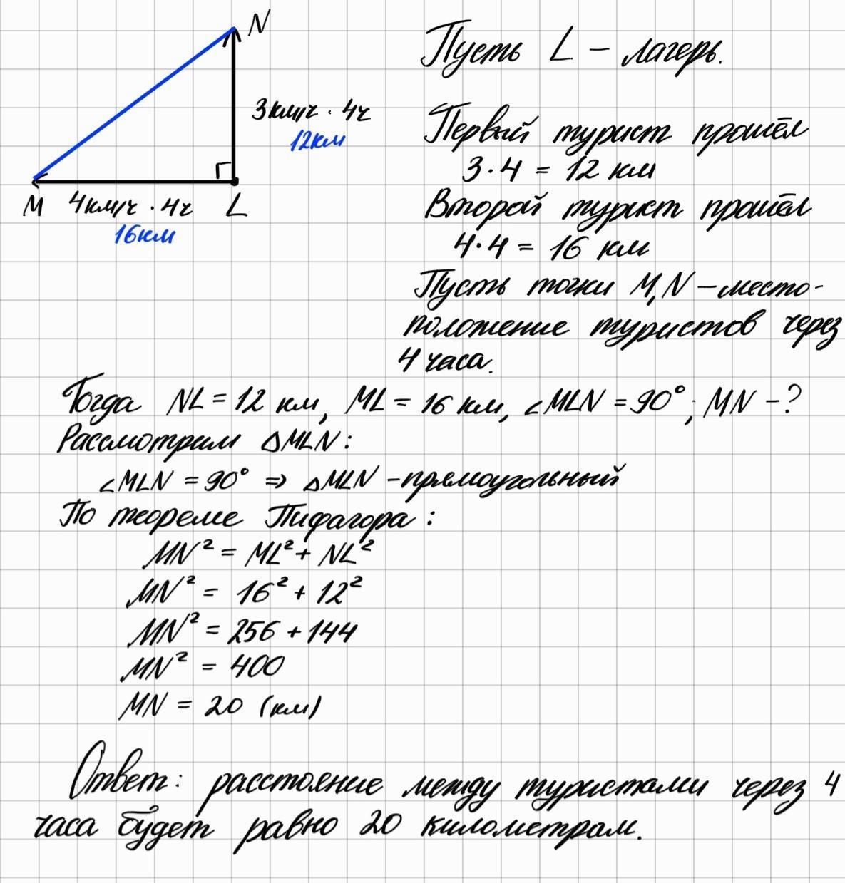 Два туриста одновременно вышли из лагеря. Первый шёл на сервер со скоростью 3 км/ч. второй шёл на запад о скоростью 4 км/ч. Каким будет расстояние между ними через 4 часа.