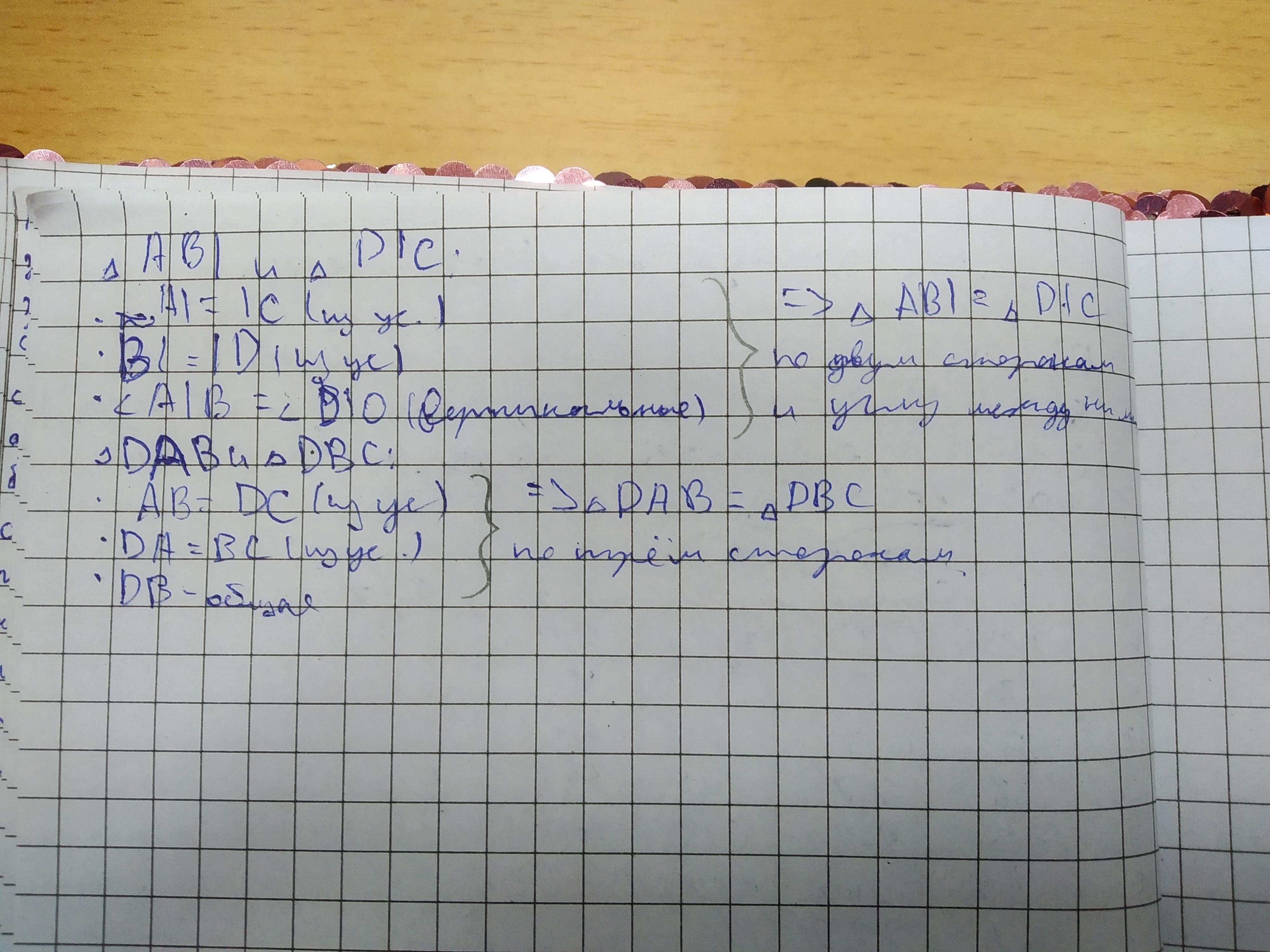 1. Треугольники равны по 2ум сторонам и углу между ними.( Вертикальные углы равны, а стороны равны по условию)