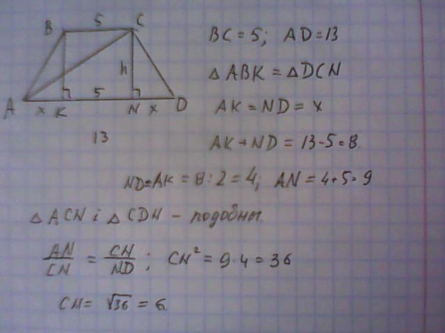 Основи рівнобічної трапеції дорівнюють 5 см і 13 см.