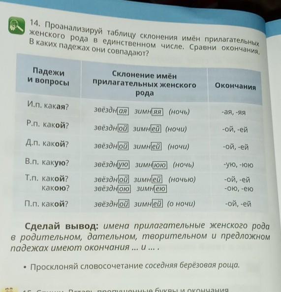 проанализируй таблицу склонения имен прилагательных женского рода в единственном числе.сравни окончания в каких падежах они совпадают