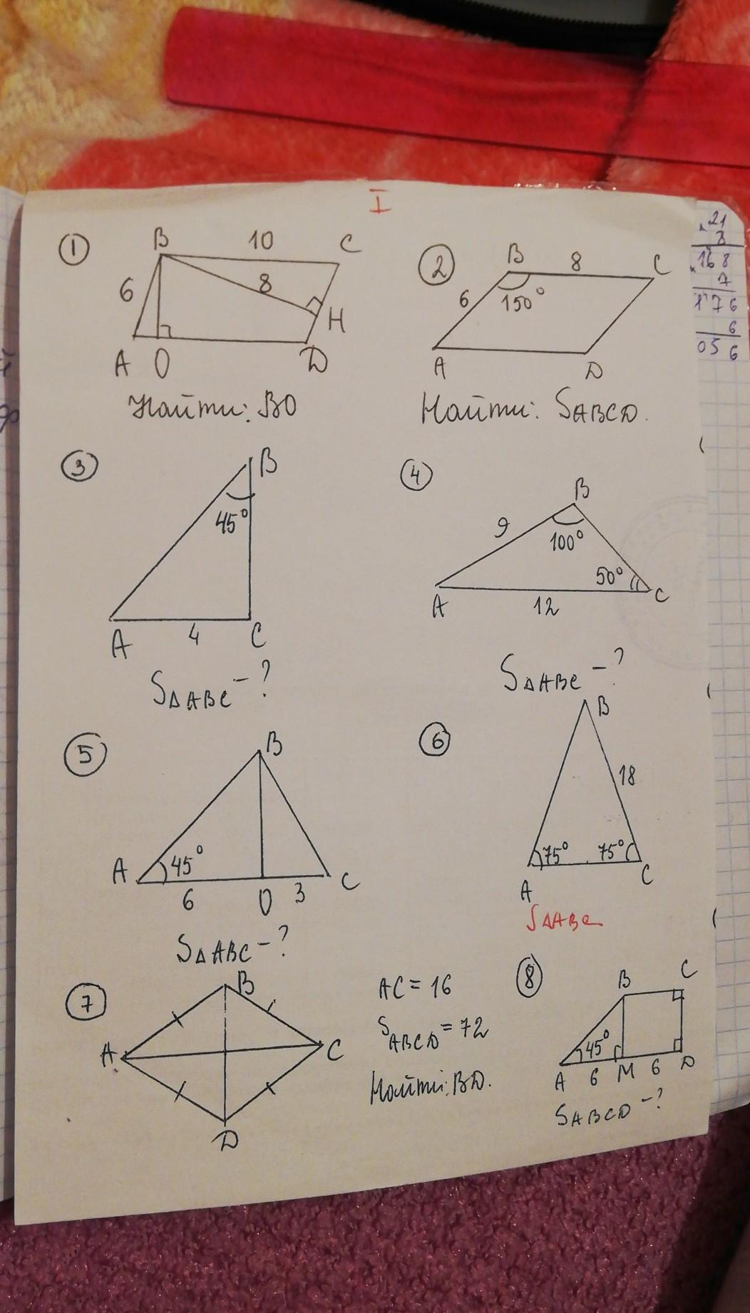 2.проводим высоту из вершины B, допустим точка O, т.к. треугольник ABO- прямоугольный, BO=1/2AB; BO=3, AD=BC=8(по св. четырехугольника)