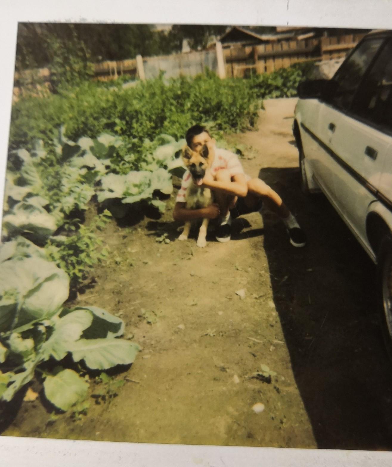 Мальчик лет 14, очень счастлив возможно из-за того что ему купили собаку, потому что собака тоже маленькая. Мальчик из средней семьи потому что у его родителей есть машина.