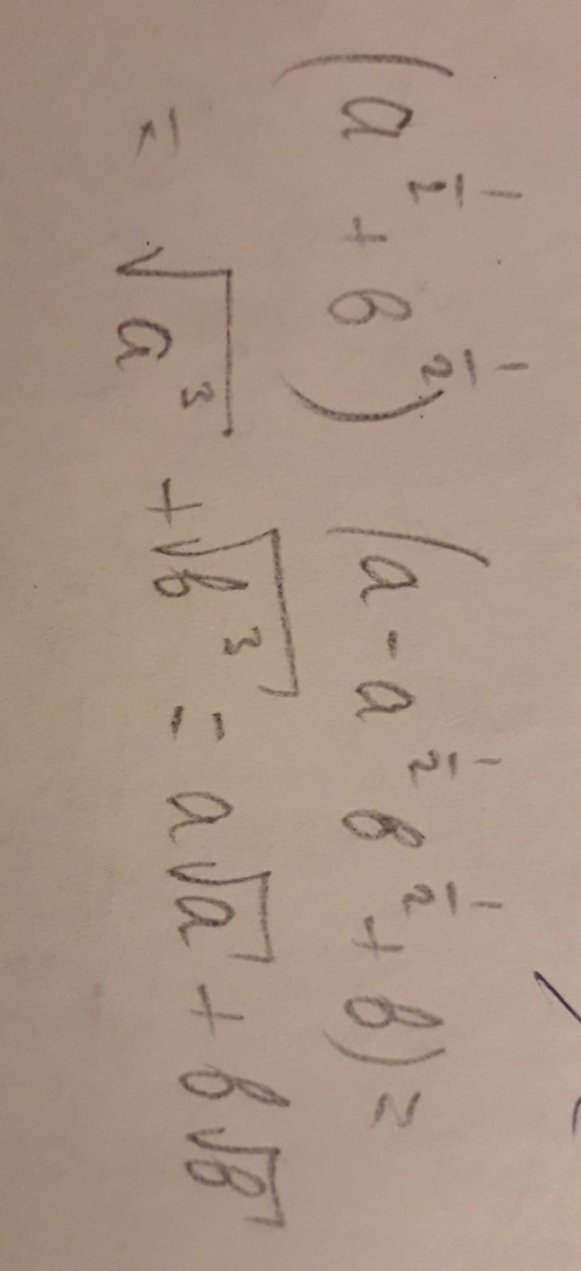 (а^1/2+b^1/2)(a-a^1/2×b^1/2+b)=корень а^3 +корень b^3=а корень а+b корень b