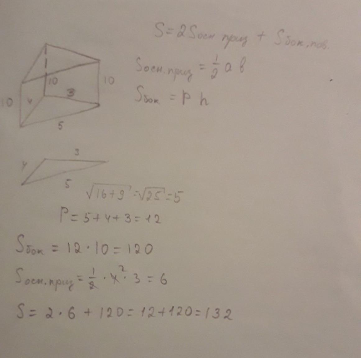 В основе прямой призмы лежит прямоугольный треугольник, катеты которого равны 4 см и 3 см. Найти площадь полной поверхности призмы. Если ее боковое ребро равно 10 см.