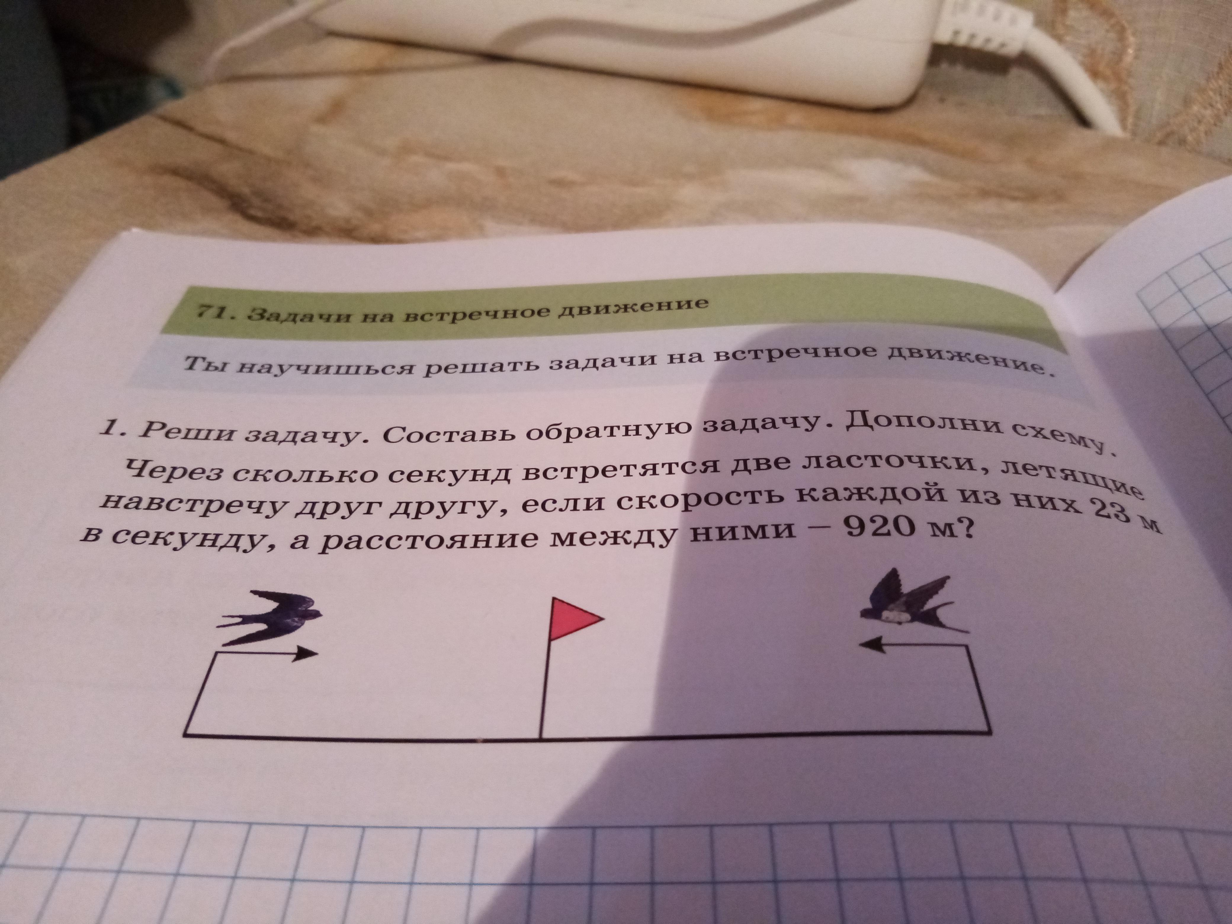 обратная задача - какова скорость ласточек, если расстояние между ними 920 м, а время, через которое они встретятся - 20 секунд.
