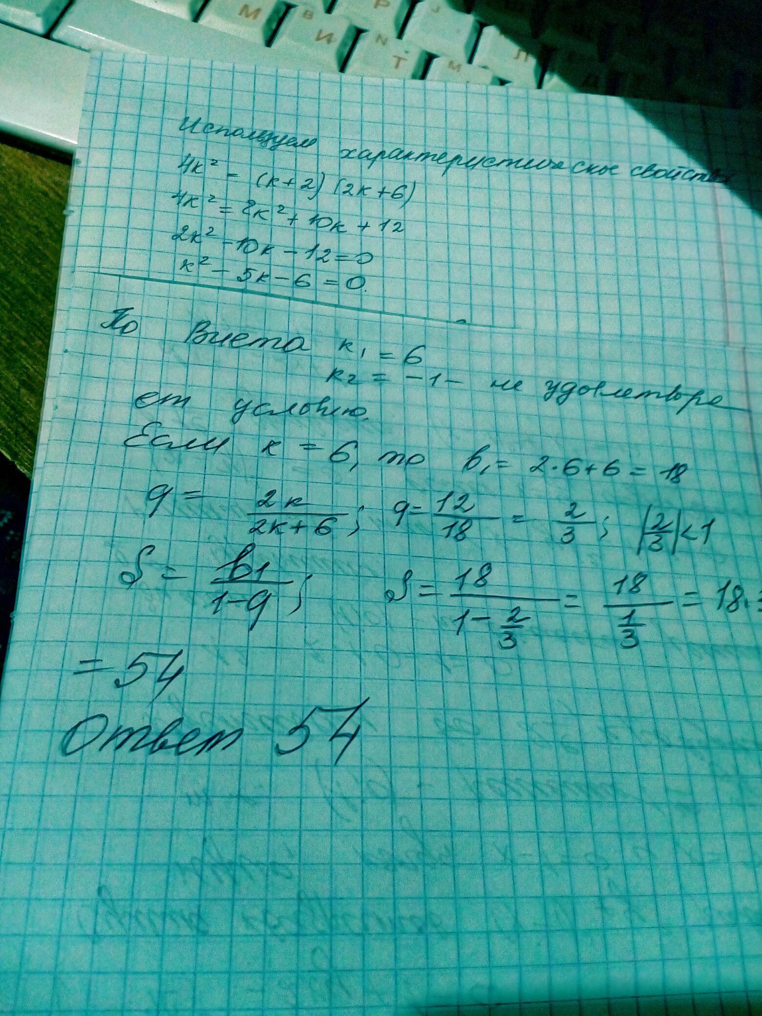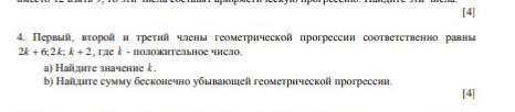 Первый, второй и третий члены геометрической прогрессии соответственно равны 2k+6, 2k, k+2, k-положительное число. найдите значение к. найдите сумму бесконечно убывающей геом. прогрессии