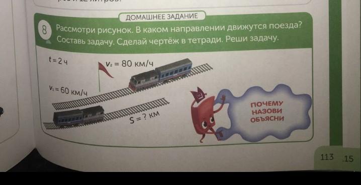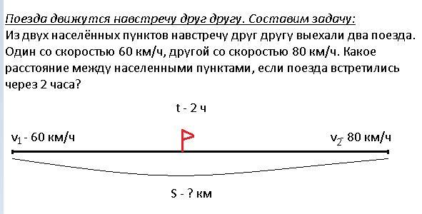 Рассмотри рисунок. В каком направлении движутся поезда? Составь задачу. Сделай чертеж в тетради.реши задачу. t=2 ч