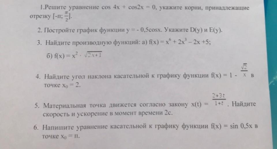 4)\; \; f(x)=1-\frac{\sqrt2}{x}\; \; ,\; \; x_0=2\\\\f'(x)=-\frac{-\sqrt2}{x^2}=\frac{\sqrt2}{x^2}\; \; ,\; \; k=tg\varphi =f'(2)=\frac{\sqrt2}{4}=\frac{1}{2\sqrt2}\\\\\varphi =arctg\frac{1}{2\sqrt2}\\\\\\6)\; \; f(x)=sin0,5x\; \; ,\; \; x_0=\pi \\\\f(\pi )=1\; \; ,\; \; f'(x)=0,5\cdot cos0,5x\; \; ,\; \; f'(\pi )=0,5\cdot 0=0\\\\y-1=0\cdot (x-\pi )\\\\y=1