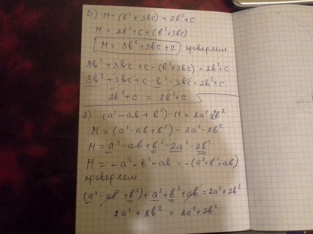 Замените М многочленом так чтобы полученное равенство было тождеством: B)М-(b^2+3bc)=2b^2+c