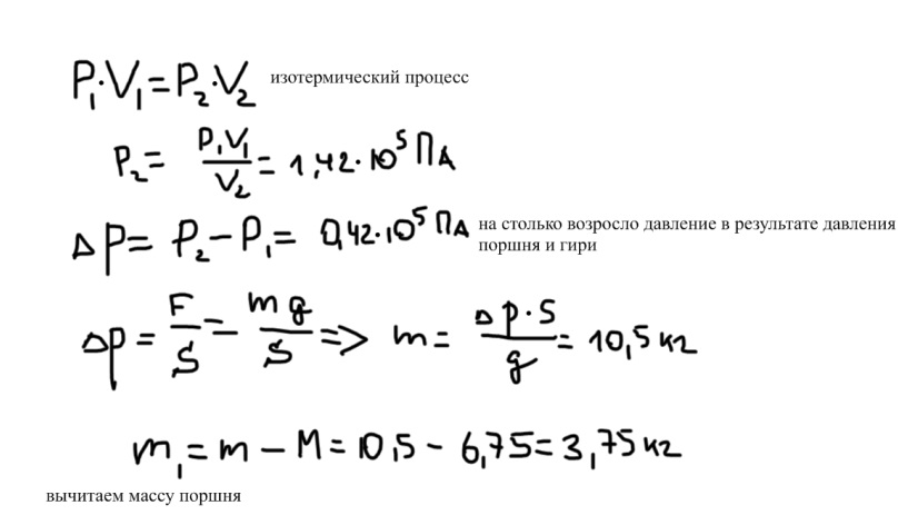 В вертикально поставленном цилиндре под поршнем находится 300 см кубических газа. Масса поршня - 6,75 кг, площадь 25 см. на поршень поставили гири, и он опустился, сжав газ до объёма 212 см куб. найти массу гирь. Процесс изотермический, атм. давление нормальное.