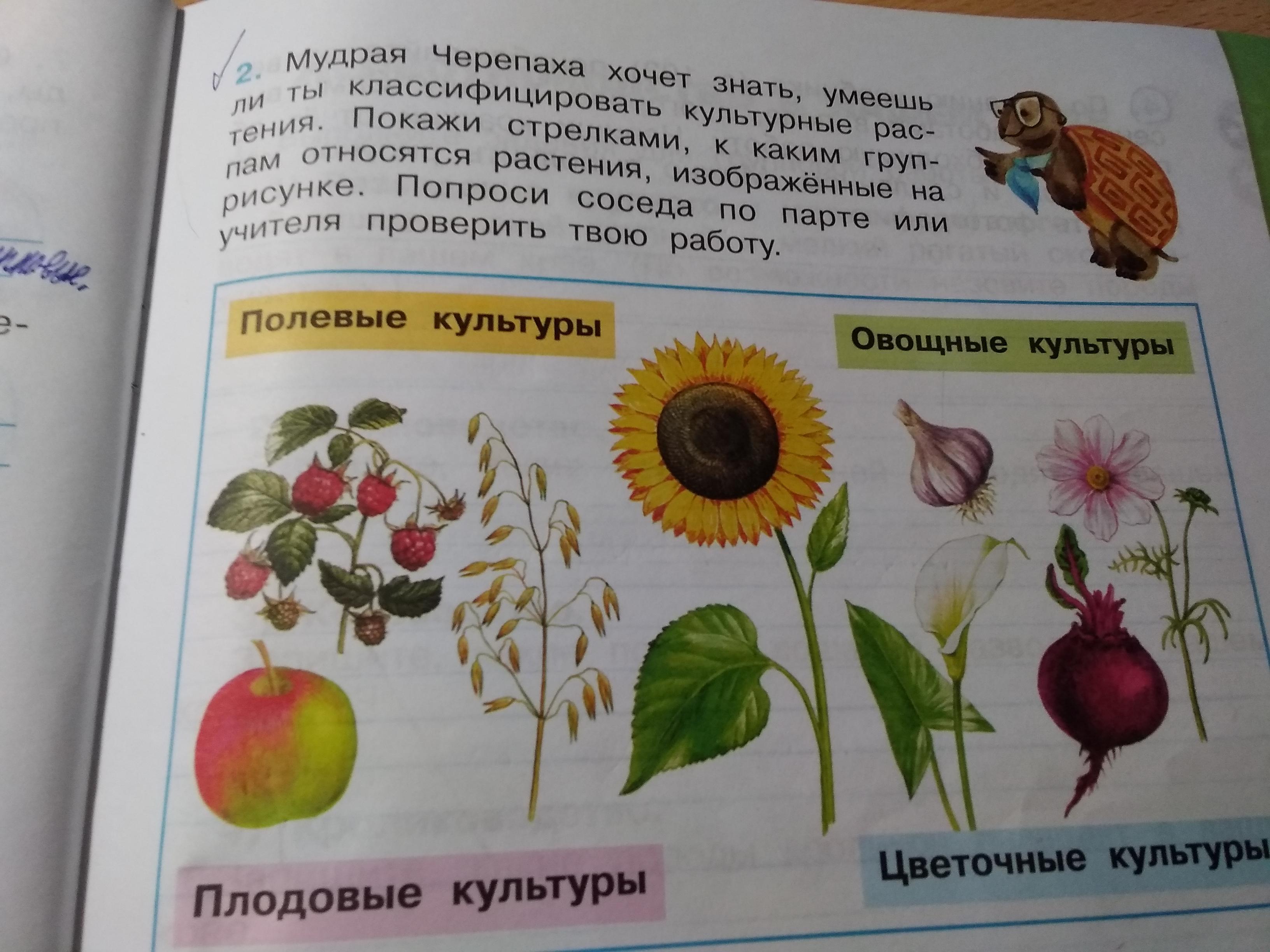 Ответ:полевые:пшеница,подсолнух.плодовые:яблоко,клубника.овощные:лук,редис(или репа,не шарю)))цветочные:те 2 цветка