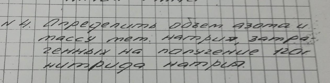 определить обьем азота и массу металла натрия затраченных на получение 120 г нитрида натрия!! Помогите пожалуйста