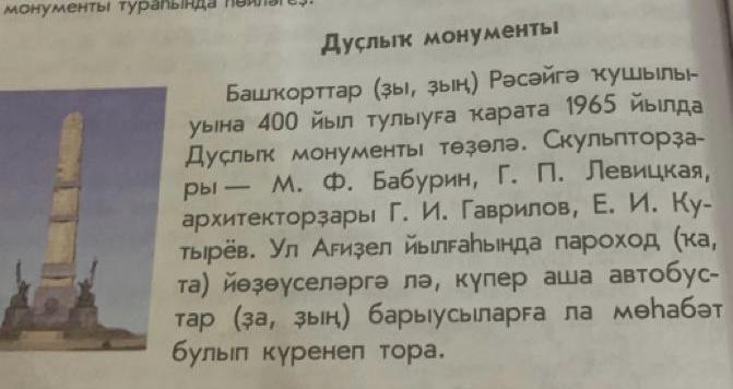 Ответ:Памятники династии Базары (танцы, династии) были добавлены к 400-летию эпохи Возрождения, в 1965 году здесь был установлен памятник Дуслику. Скульпторы - М F. Бабурин Г. P. Левицкая, архитектурный дизайнер. Да. Гаврилов Э. Да. Ку кваров. В деревне Агджил пароход, а также оживленные автобусные маршруты могут быть использованы как ветер.