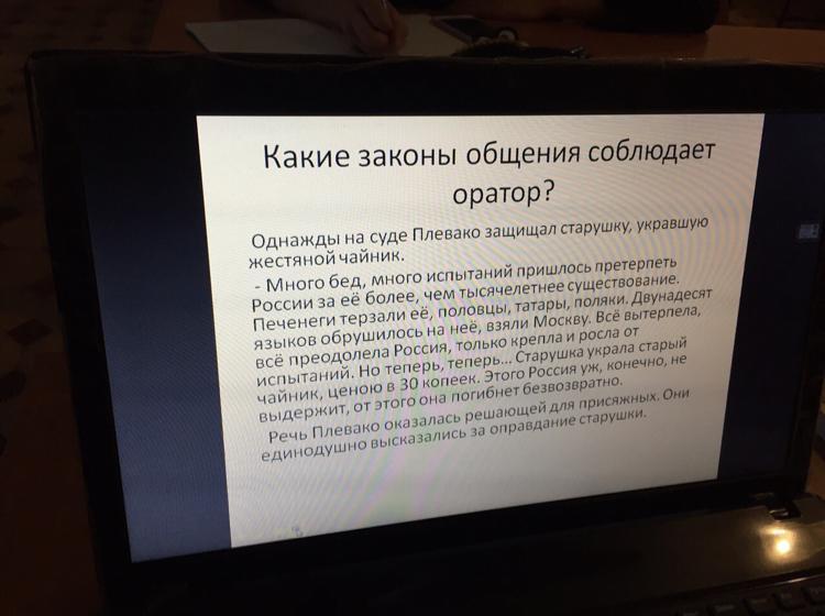 Какие законы общения соблюдает оратор? Однажды на суде Плевако защищал старушку, укравшую жестяной чайник. - Много бед, много испытаний пришлось претерпеть России за её более, чем тысячелетнее существование. Печенеги терзали её, половцы, татары, поляки. Двунадесят языков обрушилось на неё, взяли Москву. Всё вытерпела, всё преодолела Россия, только крепла и росла от испытаний. Но теперь, теперь... Старушка украла старый чайник, ценою в 30 копеек. Этого Россия уж, конечно, не выдержит, от этого она погибнет безвозвратно. Речь Плевако оказалась решающей для присяжных. Они единодушно высказались за оправдание старушки.