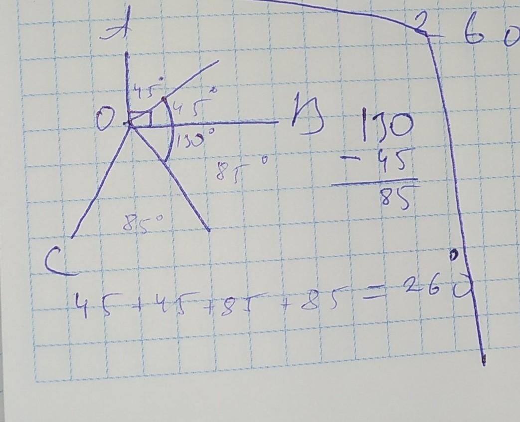 Із точки О проведено промені ОА .ОВ і ОС.Кут між бісектрисами кутів АОВ і СОВ дорівнює 130 градусів. Знайдіть градусну міру кута СОА, якщо ОА перпендікулярна ОВ.