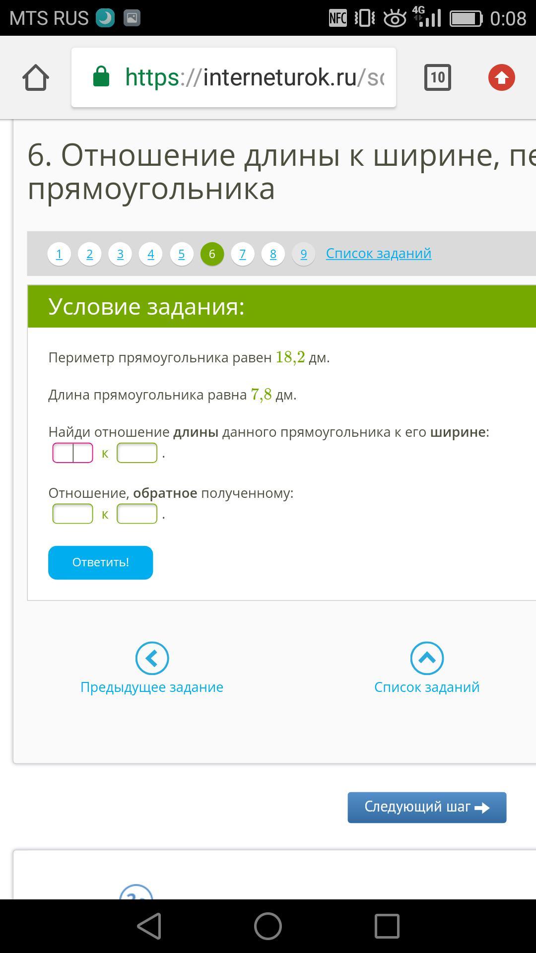 Извини, что не досмотрел. Периметр прямоугольника равен 2 длины + 2 ширины. Т.к. длина равна 7,8 дм получается, что 2 длины равны 7,8х2=15,6 дм. Периметр равен 18,2 дм, значит 2 ширины равны 18,2-15,6=2,6 дм. Отсюда, ширина участка равна 2,6:2=1,3 дм. Отношение длины участка к ширине 7,8:1,3=6:1 и наоборот ширины к длине 1,3:7,8=1:6