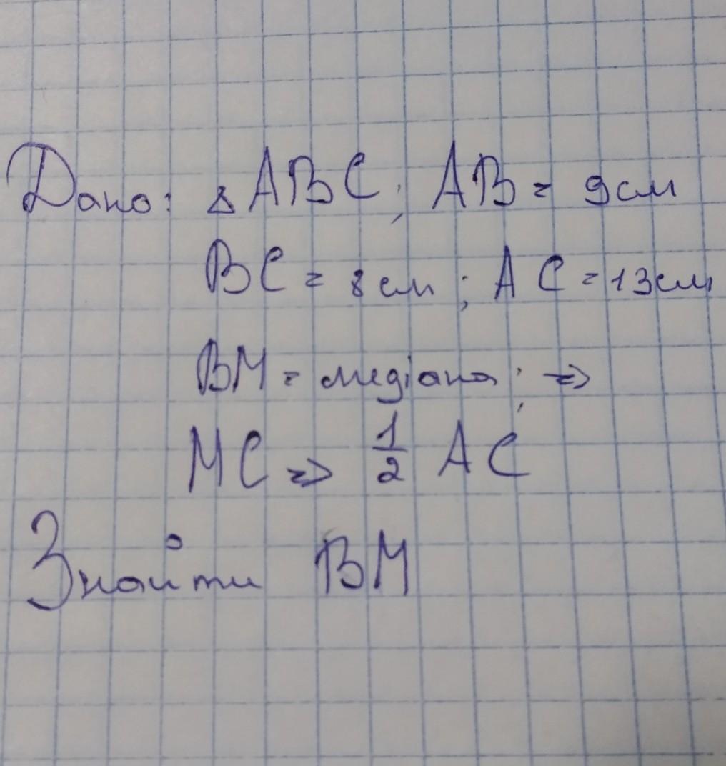 Т.к ВМ медиана=> ВМ = 1/2 АС= 13: 2 = 6.5см