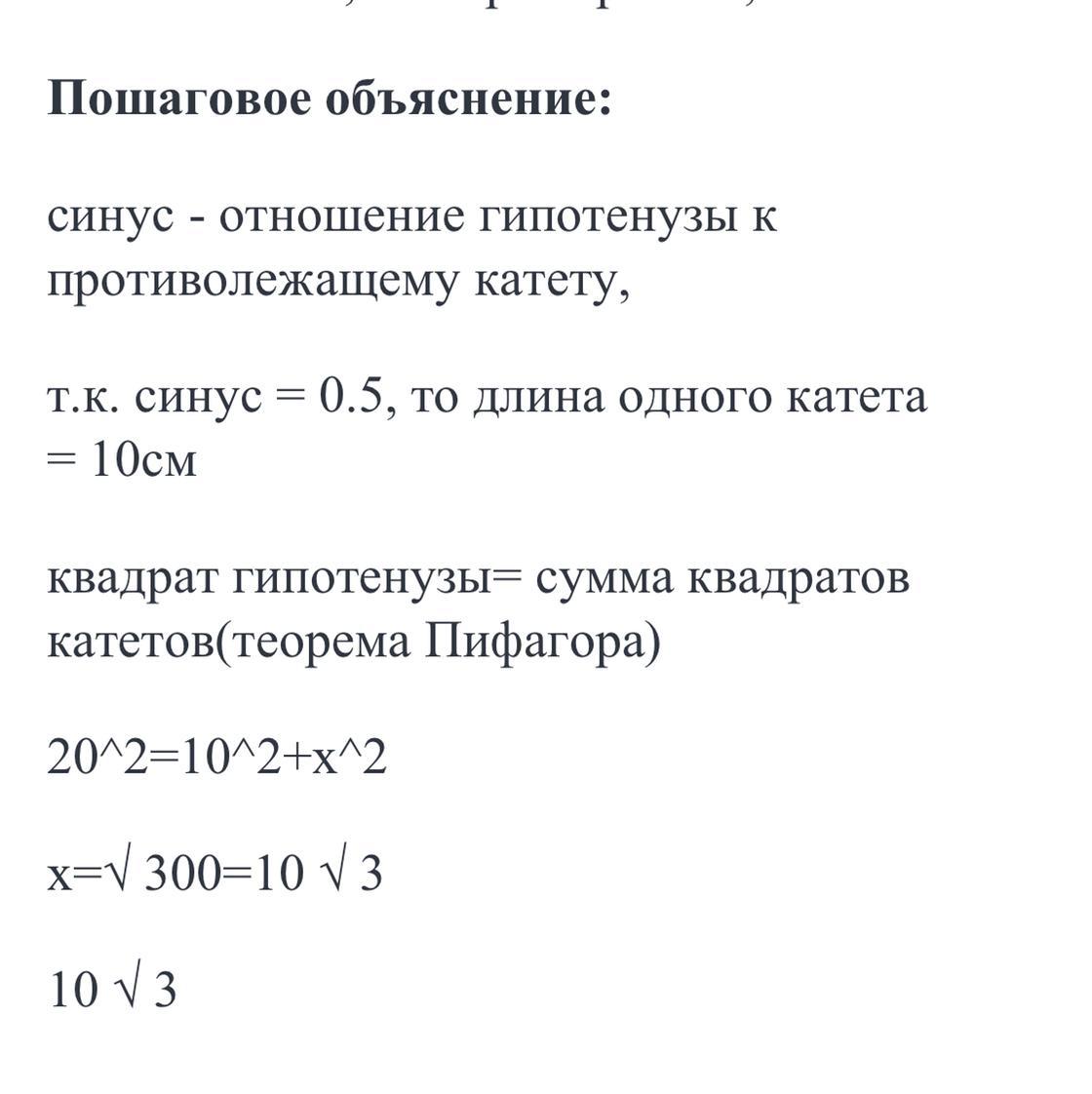 В прямоугольником треугольнике гипотенуза равна 20cm, а синус одного из острых углов равен 0.5. Найдите катеты треугольника.