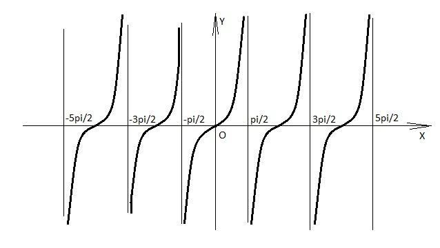 Вот на рисунке показан примерный график y = tg x.