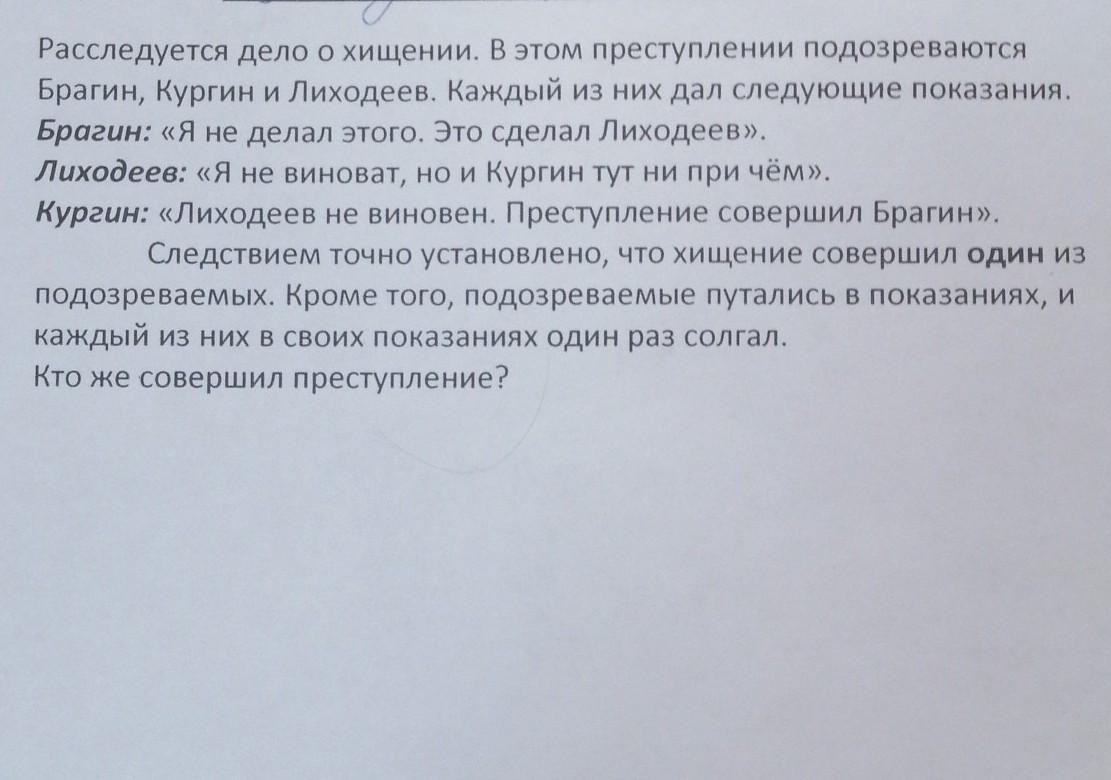 Тогда оба утверждения Брагина («Я не делал этого. Это сделал Лиходеев») ложны ( В рассматриваемом случае истинны утверждения: "Лиходеев не виновен. Брагин преступление совершил"). Но, по условию, если Брагин преступник, то одно его утверждение должно быть ложно, а второе - истинно. Мы пришли к противоречию. Значит, наше предположение о виновности Кургина и Брагина неверно.