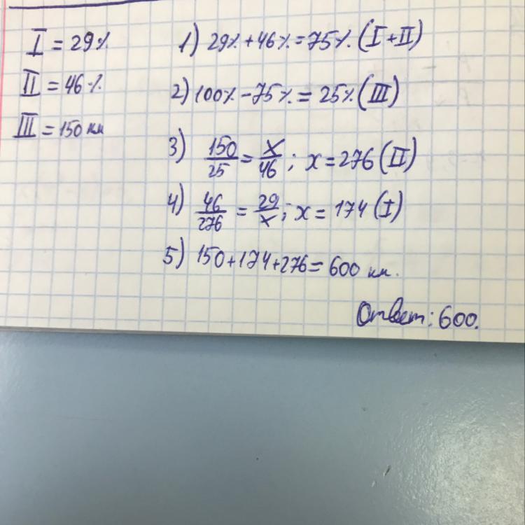 Бригада в первую неделю отремонтировала 29% дороги, во вторую неделю 46%, а в третью - остальные 150 км. Сколько всего дороги было отремонтировано?