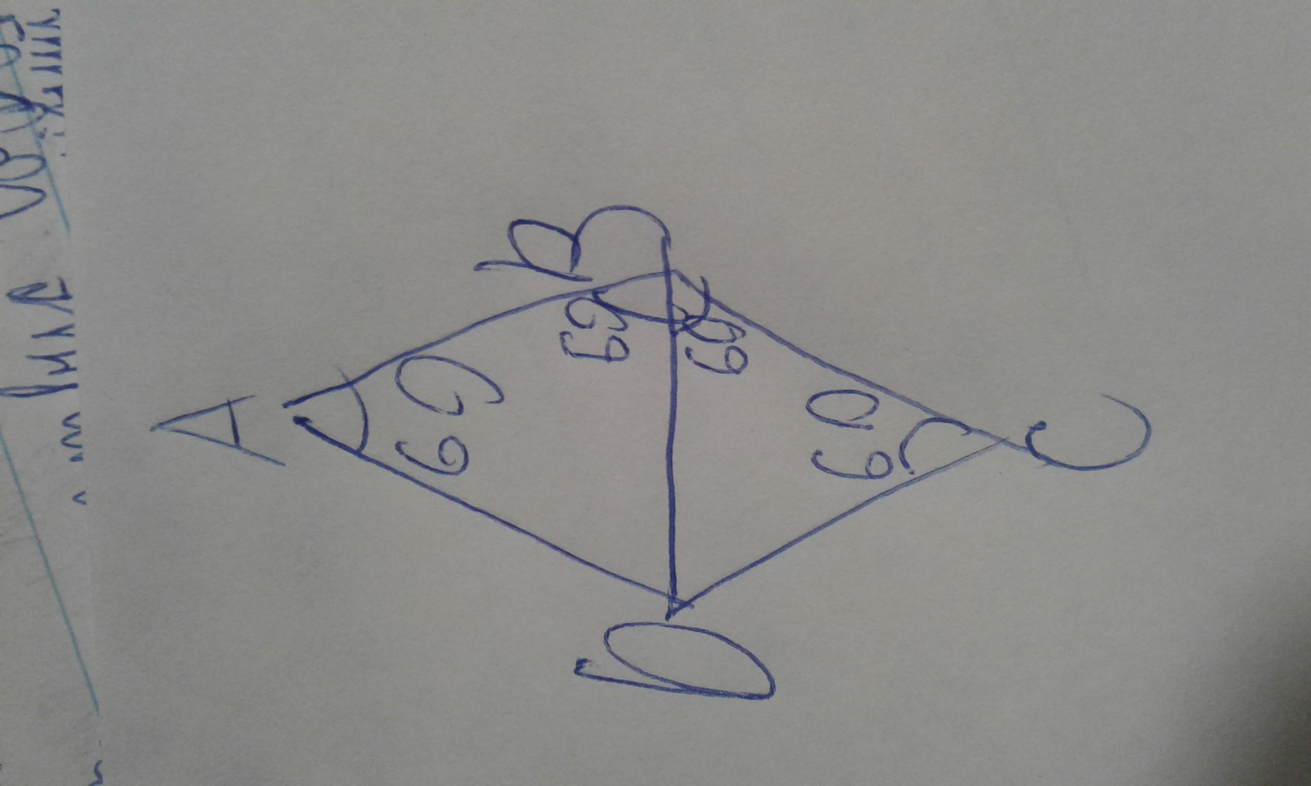 Ответ:если я правильно поняла то кут А=60,тогда противопогодная сторон тоже 60. А остальные кута тогда 120. То есть кут АВС= 120. Отсюда АВС=АВD+DBC. ABD=DEC. Отсюда 120:2=60