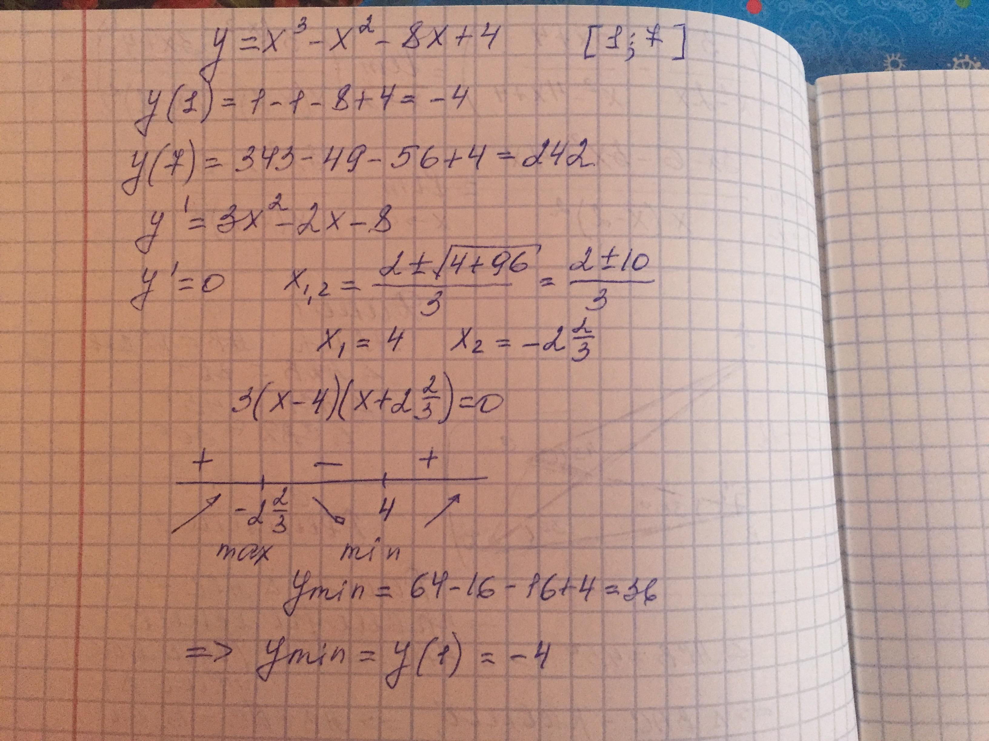производная в т. 4/3 меняет знак с (-) на(+), это точка min, находим значение функции в этой точке у(4/3)=(4/3)^3-(4/3)^2-8*4/3+4=64/27-16/9-32/3+4= ( остается подсчитать наим. знач. ф-ции)