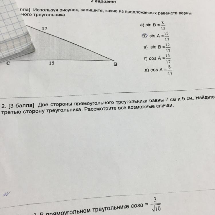 Две стороны прямоугольного треугольника равны 7см и 9 см найдите третью сторону треугольника