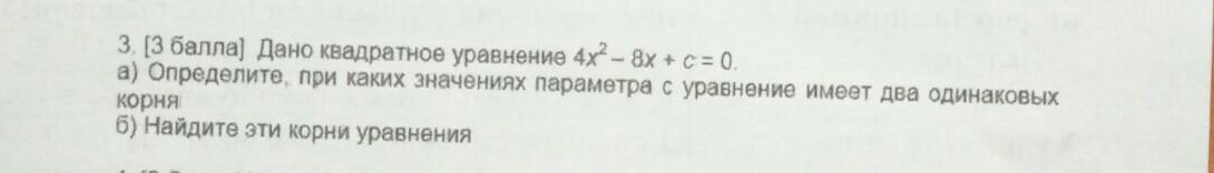 а=4 в=-8 с=1 D=64-4×4×c=64-16c. 64-16c>0. 64-16c=0. 64 4-16c<0. C>4.2 действительны корня C=4.1 действительный корень C<4. Нет действительных корней