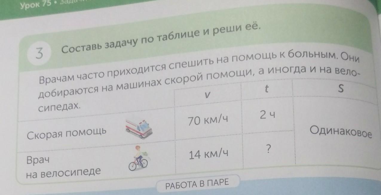 Доктор на автомобиле "Скорая помощь", скорость которого 70 км/ч, добирается до больного за 2 часа. За сколько времени доберется до того же больного доктор на велосипеде, если его скорость будет 14 км/ч?
