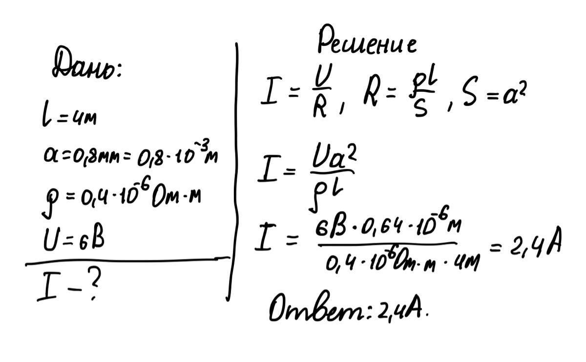 никелиновый провод длиной 4 м и поперечным сечением 0,8 мм квадрат подключен к цепи какой силы ток пройдет через провод если к концам продать напряжение 6 Вт удельное сопротивление нихрома p=0,4×10-6 степени Ом×м