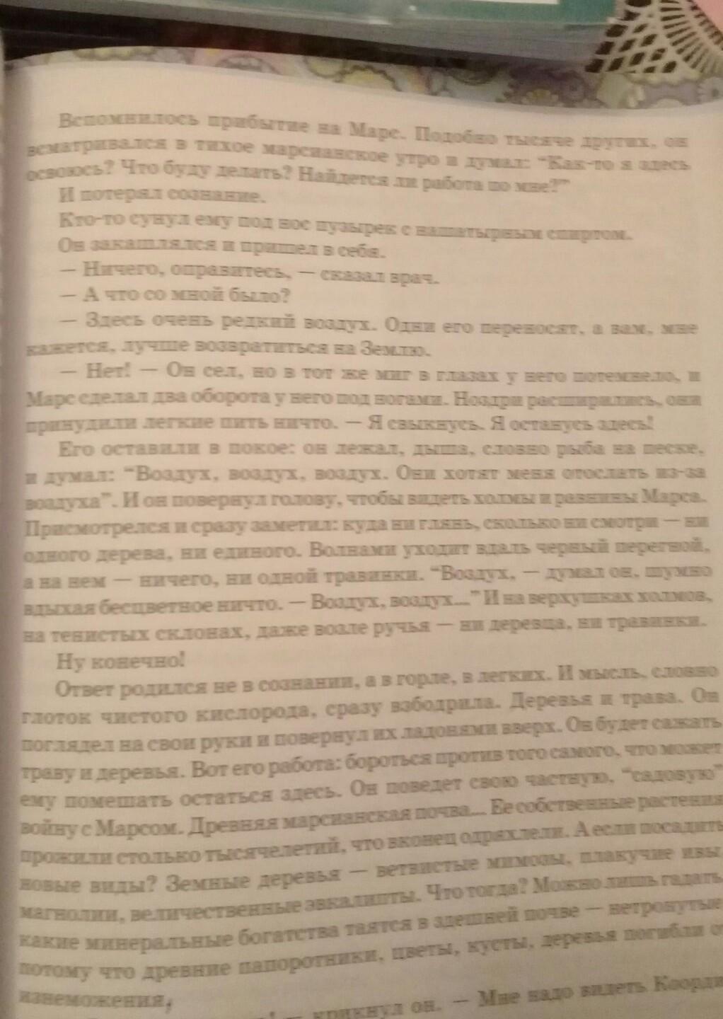 Ответ: В приведенном небольшом отрывке слово дождь встречается в разных вариантах девять раз. Это ни в коем случае не свидетельствует о неумении писателя подобрать нужный синоним, чтобы не повторять одно и то же слово. Много раз повторяя с разной интонацией слово дождь в данном тексте, Брэдбери придает своему рассказу требуемый оттенок экспрессивности, усиливает характер ощущений читателя. Но самое главное - он таким приемом выражает восторженные чувства главного героя Бенджамена Дрисколла, миссия которого по озеленению планеты Марс теперь будет выполнена. Теперь он удовлетворен и может отдыхать, ведь пошел дождь.