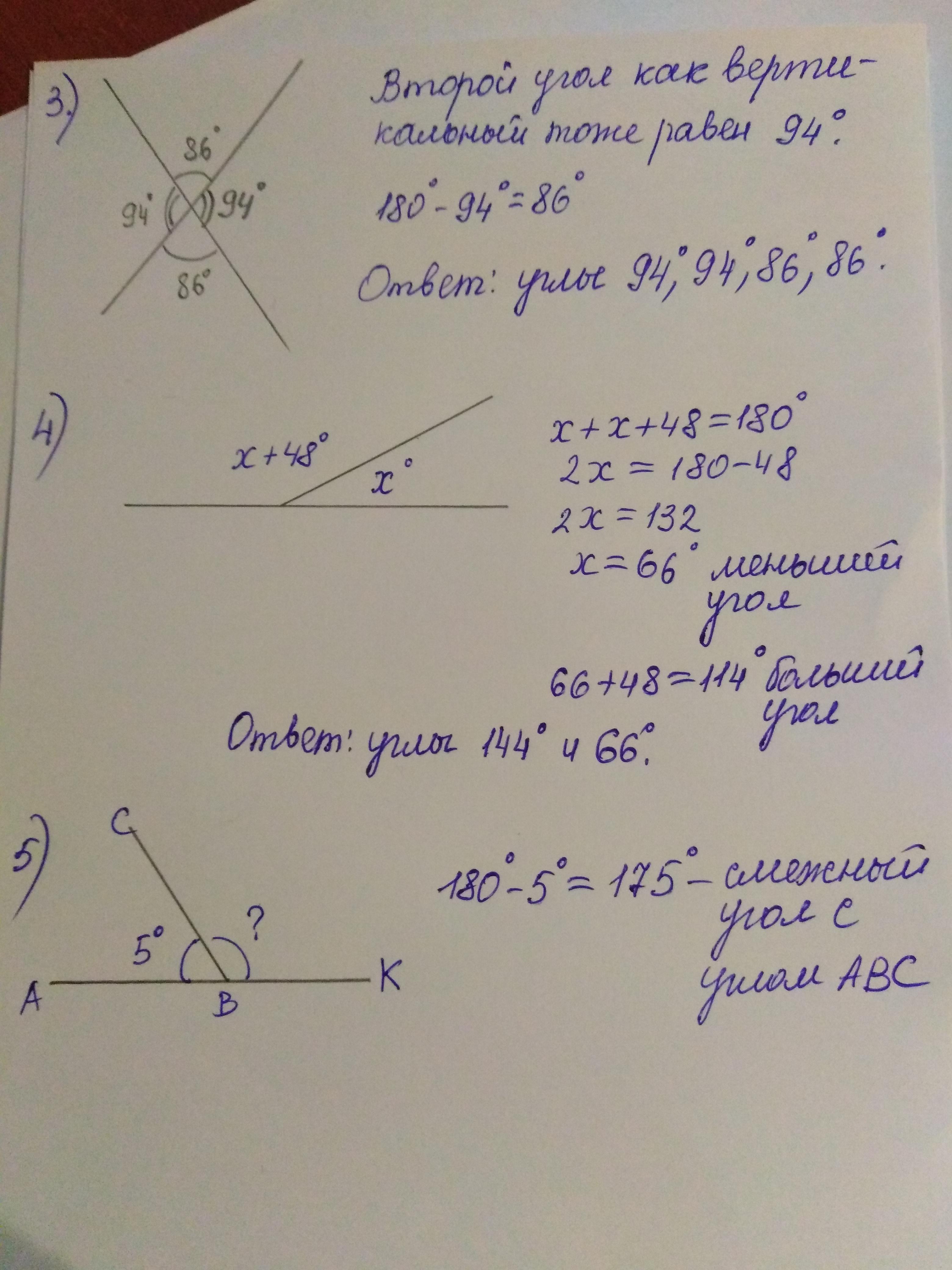 3.Один из углов образовавшийся при пересечении двух прямых,равен 94 градуса,найдите градусные меры остальных углов