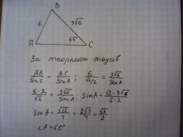Знайдіть кут А трикутника АВС, якщо АС=12 см, ВС=4√3см, кут В= 60°