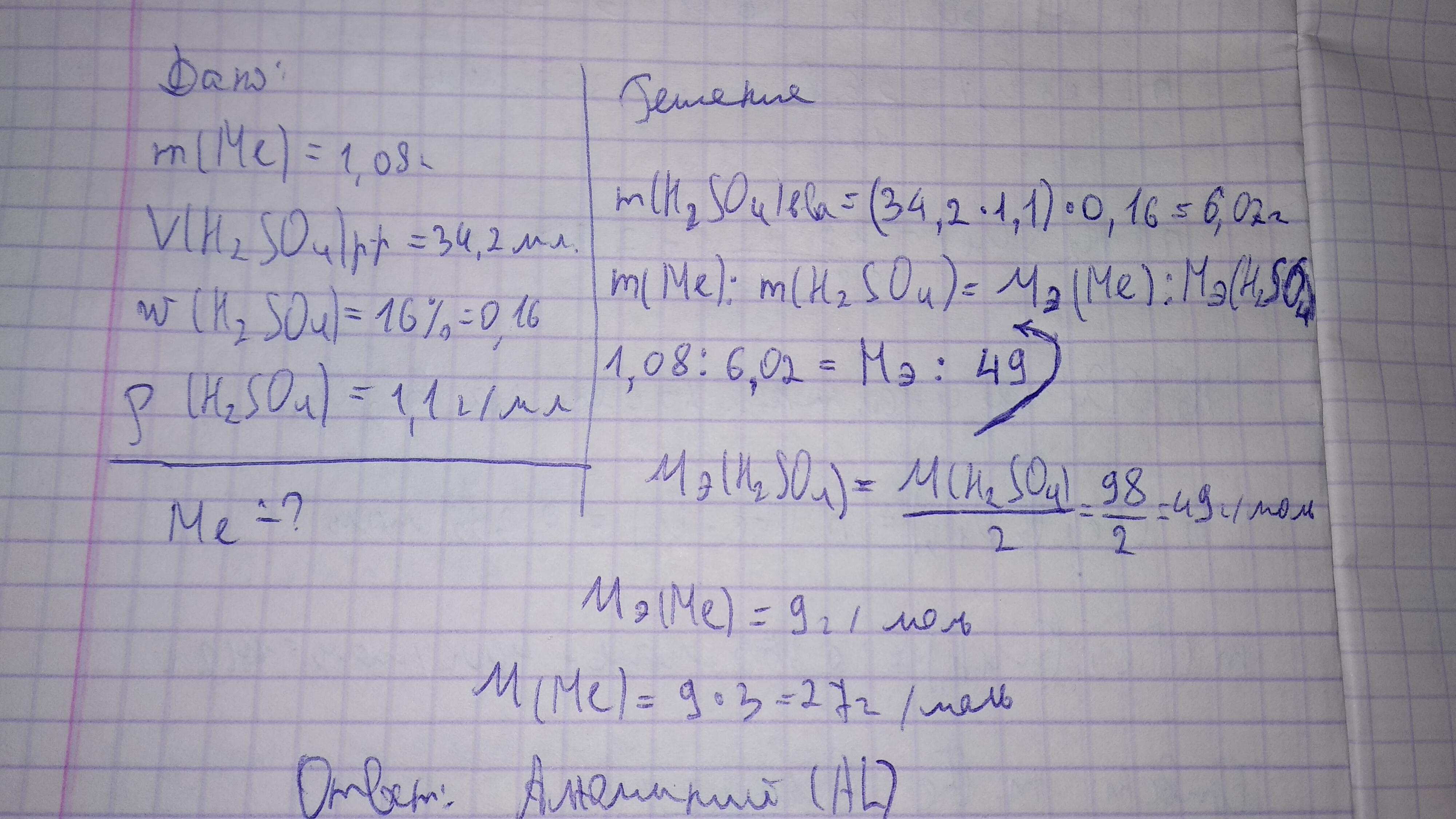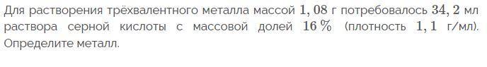 Для растворения трехвалентного металла массой 1,08 г потребовалось 34,2 мл раствора серной кислоты с массовой долей 16% и плотностью 1,1 г/мл. Определите металл.