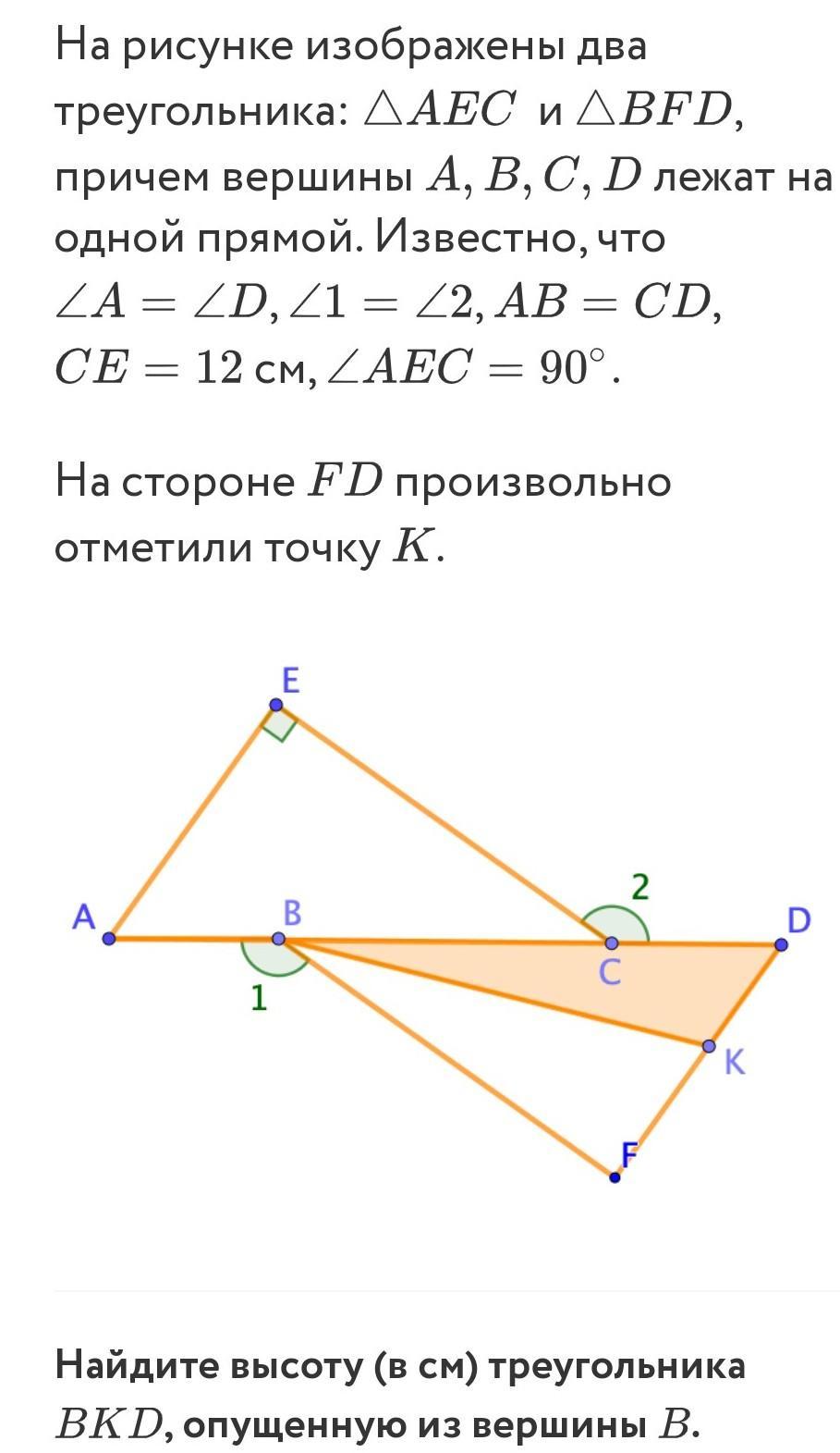 4.Т.к. треугольники являются равными и один угол в треугольнике прямой (по условиям задачи), то и угол F в треугольнике BFD так же прямой. Высота треугольника BKD будет равна высоте треугольника ВFD. Высота-это перпендикулярно, опущеный из вершины на противоположную сторону. Угол ВFD прямой и сторона BF равна стороне СЕ. BF является высотой и соответственно она равна 12 см.