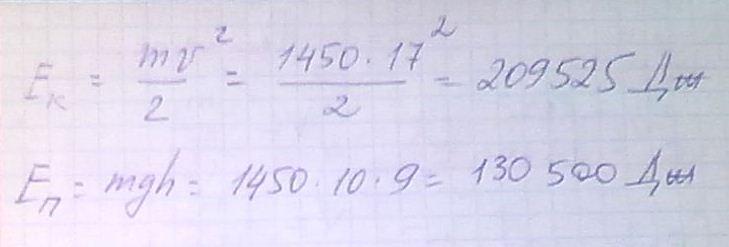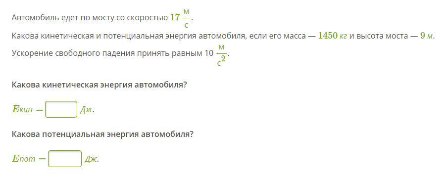 Автомобиль едет по мосту со скоростью 17 мс. Какова кинетическая и потенциальная энергия автомобиля, если его масса — 1450 кг и высота моста — 9 м. Ускорение свободного падения принять равным 10 мс2.