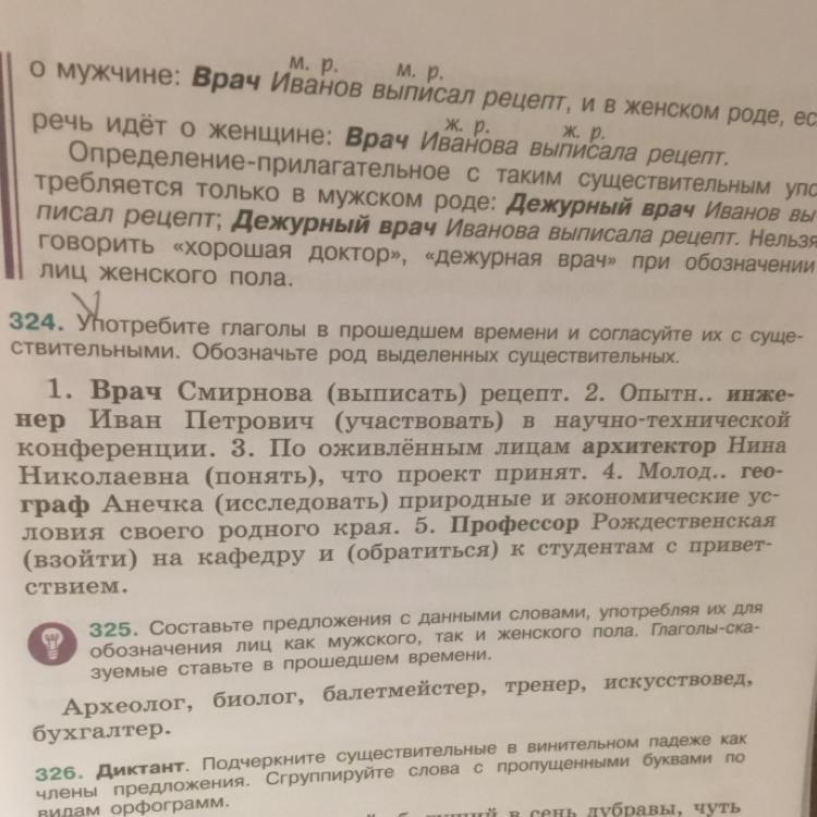 324. Употребите глаголы в прошедшем времени и согласуйте их с суще-